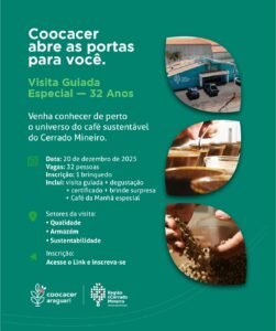 A Coocacer Araguari completa 32 anos em 2025 e marca a data com uma ação voltada à comunidade local e aos agentes ligados à cafeicultura do Cerrado Mineiro. No dia 20 de dezembro, a cooperativa realiza a Experiência Enraizando o Futuro – Visita Guiada Especial, iniciativa que propõe apresentar, de forma direta e acessível, as etapas percorridas pelo café desde a chegada à cooperativa até o mercado consumidor.