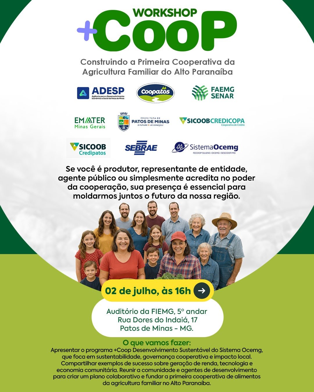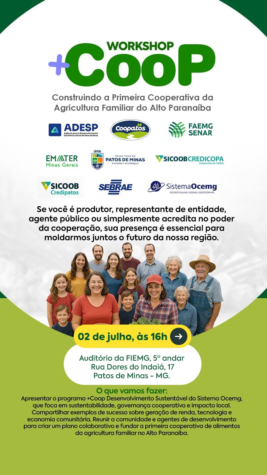 O encontro tem como foco a criação de uma nova estrutura cooperativa, exclusiva para os pequenos produtores da agricultura familiar. A proposta faz parte do programa +Coop Desenvolvimento Sustentável, promovido pelo Sistema Ocemg, e chega ao Alto Paranaíba com apoio de importantes entidades, como ADESP – Agência para o Desenvolvimento Econômico e Social de Patos de Minas, Coopatos, SEBRAE, FAEMG/SENAR, EMATER, SICOOB Credipatos, SICOOB Credicopa, Sindicato dos Produtores Rurais e Prefeitura de Patos de Minas.
