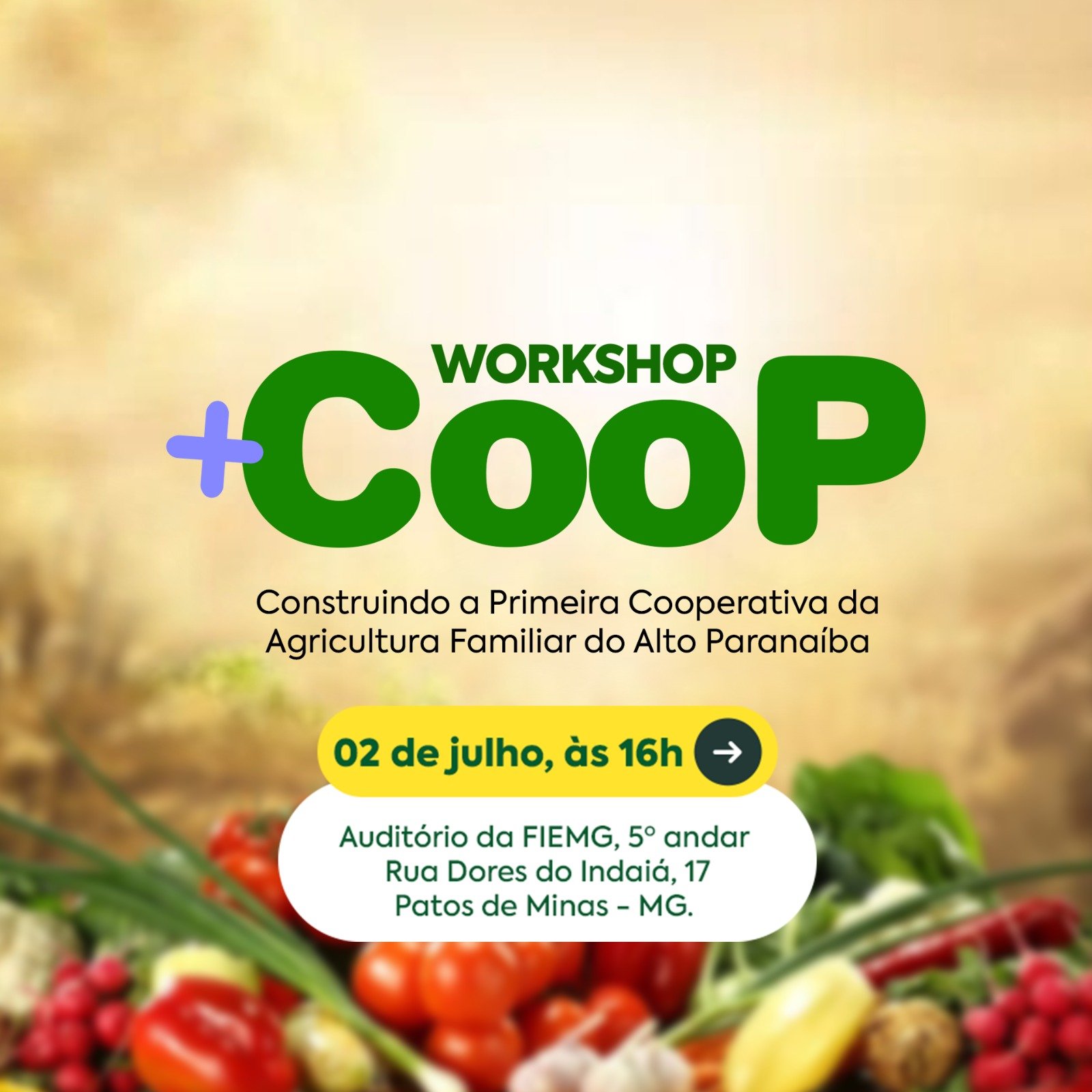 Nesta quarta-feira, 2 de julho, às 16h, Patos de Minas será o ponto de partida para um novo modelo de organização da agricultura familiar no Alto Paranaíba. A cidade receberá o Workshop +Coop – Construindo a Primeira Cooperativa da Agricultura Familiar da Região, evento que vai reunir agricultores, instituições de apoio, sindicatos, agentes públicos e representantes do setor produtivo no auditório da FIEMG Alto Paranaíba (Rua Dores do Indaiá, 17 – 5º andar).